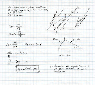 La imagen siguiente muestra el desarrollo trigonométrico para hallar la proyección del cuadrante ecuatorial sobre el plano horizontal y de esta manera obtener el cuadrante Solar horizontal para nuestro pequeño proyecto.