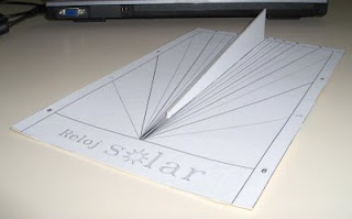 Obsérvese en la imagen la forma triangular del gnomon, la inclinación del borde superior del triángulo con respecto a la horizontal es justamente el ángulo que se corresponde con el de la latitud del lugar, de manera que una vez colocado nuestro reloj de Sol en un lugar soleado, este borde superior del gnomon queda paralelo al eje de los polos y apuntando al norte. La hora queda marcada por la sombra que se proyecta sobre el cuadrante horizontal.